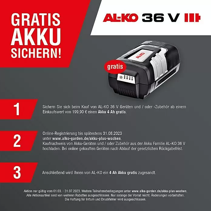 - AKTION*: 01.03. – 31.07.2023 Aktionsgerät im Wert von 199,90 € kaufen, online registrieren und Akku sichern