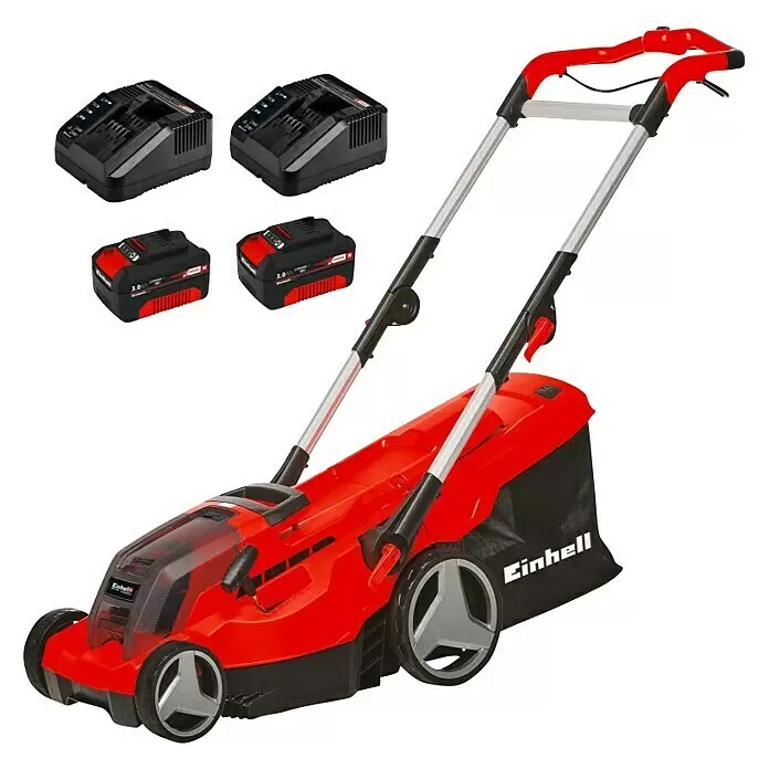 - Der Rasenmäher wird als Ready-To-Use Set mit Schnell-Ladegerät und zwei Akkus geliefert