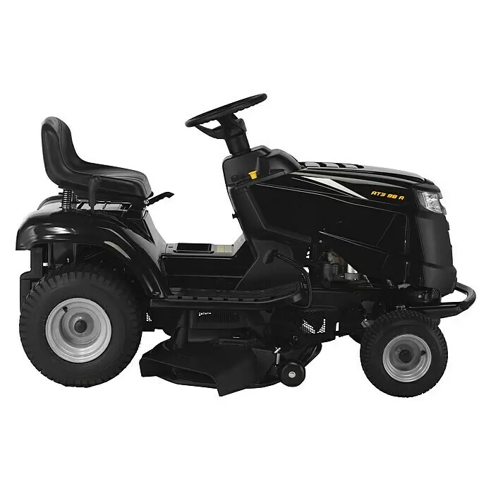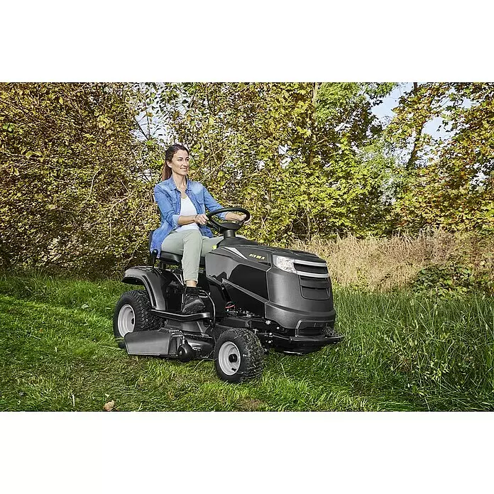 Der ALPINA AT3 98 A ist ein kompakter Seitenauswurf-Rasentraktor, der dank seines kleinen Wendekreises leicht zu fahren ist. So lassen sich Rasenflächen in der Nähe von Steinen oder Kanten problemlos schneiden. Das Herzstück des AT3 98 A ist der ST 350 Motor (Powered by STIGA), der mit einer Leistung von 6,5 kW (8,8 PS) bei 2800 U/min und einem Hubraum von 352 cm³ zu überzeugen weiß. Das Mähwerk ist mit zwei gegenläufigen Doppelmessern ausgestattet und kann bequem über die elektromagnetische Kupplung zugeschaltet werden. Danach steht Dir eine 98 cm Schnittbreite zur Verfügung, die sich in 7 Stufen, von 25 bis 80 mm, in ihrer Schnitthöhe regulieren lässt. Hierbei wird durch die Tasträder stets sichergestellt, dass ein Kontakt des Mähwerks mit dem Boden vermieden wird. Der AT3 98 A verfügt über einen Wasseranschluss, der die Reinigung des Mähraumes erleichtert. Mit dieser Ausstattung eignet sich der AT3 98 A für Rasenflächen von bis zu 4500 m². Dank der Scheinwerfer ist selbst das mähen in der Dämmerung kein Problem. Der AT3 98 A kann durch zahlreiches Zubehör, wie zum Beispiel ein Mulchkit oder ein Schneeschild für den Winterdienst, erweitert werden.