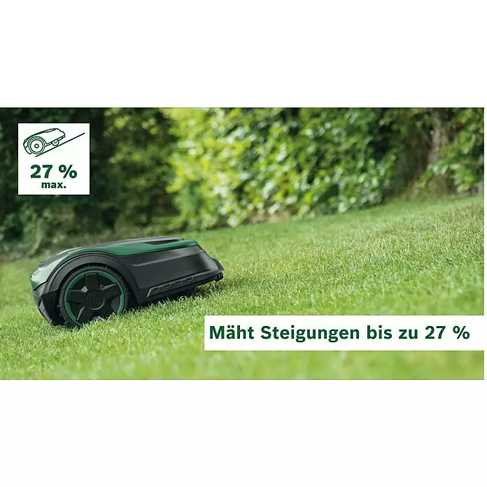 Der innovative und sprachgesteuerte Mähroboter Indego S+ 500 von Bosch mit einer Schnittbreite von 19 cm eignet sich für Rasenflächen bis zu 500 m². Steigungen bis 27 % sind für den Mähroboter kein Problem, somit können Sie ihn auch auf unebenen Gelände mähen lassen.