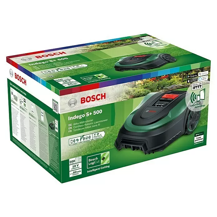 Durch das intelligente Navigationssystem LogiCut mäht er doppelt so schnell als Mäher mit Zufallsprinzip. Dank der komfortablen Höhenverstellung mittels Knopfdruck, einem Bediendisplay, dem Bosch AUTO-Kalender und der integrierten Sprachsteuerung via Alexa oder Google Assistant ist der Indego S+ 500 sehr anwenderfreundlich. Die GSM-Technologie ermöglicht einen standortunabhängigen Zugriff per Smartphone oder Tablet. Seine integrierte SmartMow-Funktion entscheidet selbstständig, wann der beste Zeitpunkt zum Mähen ist. Die MultiArea-Funktion ermöglicht das Mähen von bis zu drei weiteren Gartenflächen. Mit SpotMow kann der Indego gezielt kleine Flächen ansteuern, ideal zum Mähen von Rasenbereichen, die gewöhnlich unter Gartenmöbeln versteckt sind. Die Funktion BorderCut ermöglicht ein randnahes Mähen. Zudem verfügt der Mähroboter über einen austauschbaren Akku, der ohne größeren Aufwand aus- und eingebaut werden kann.