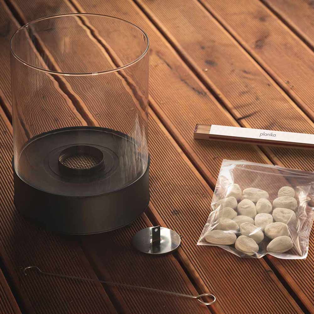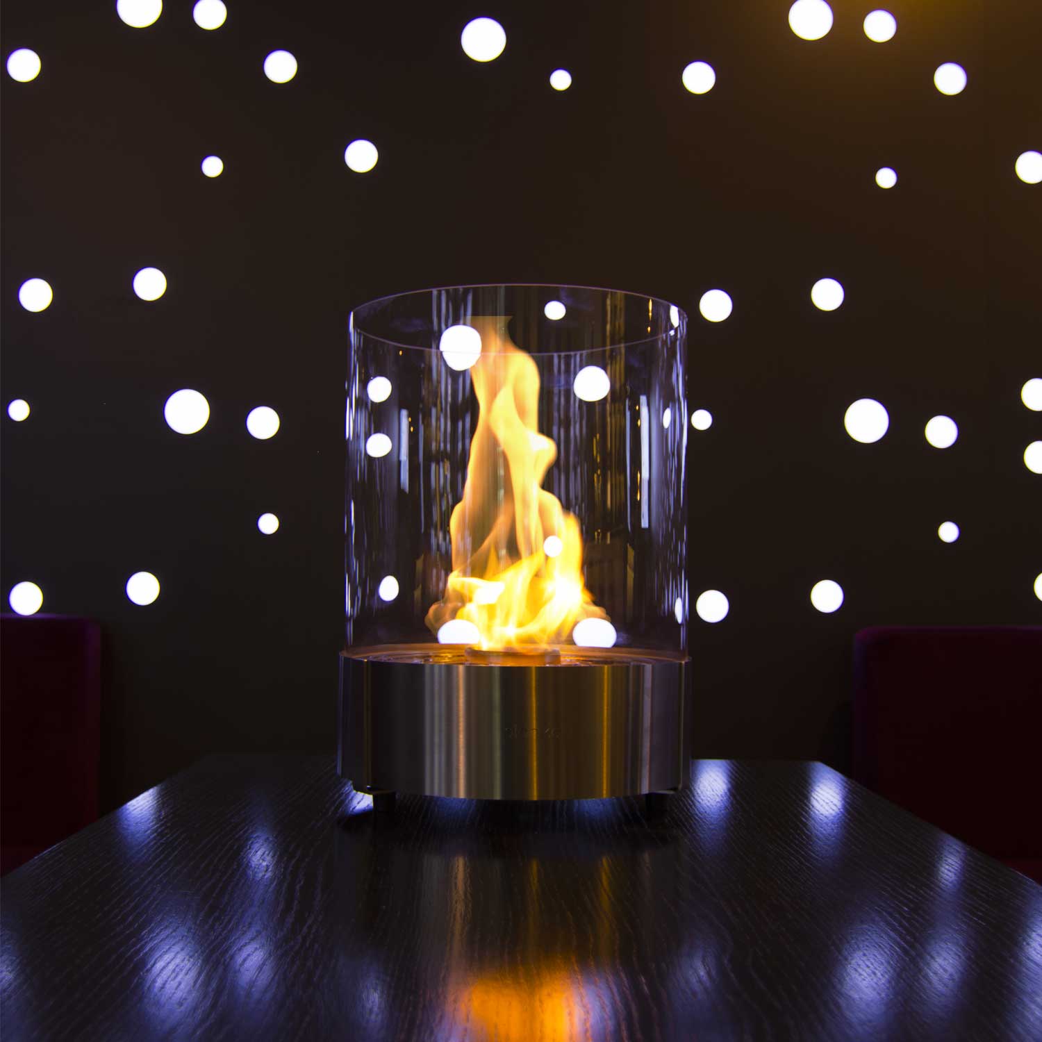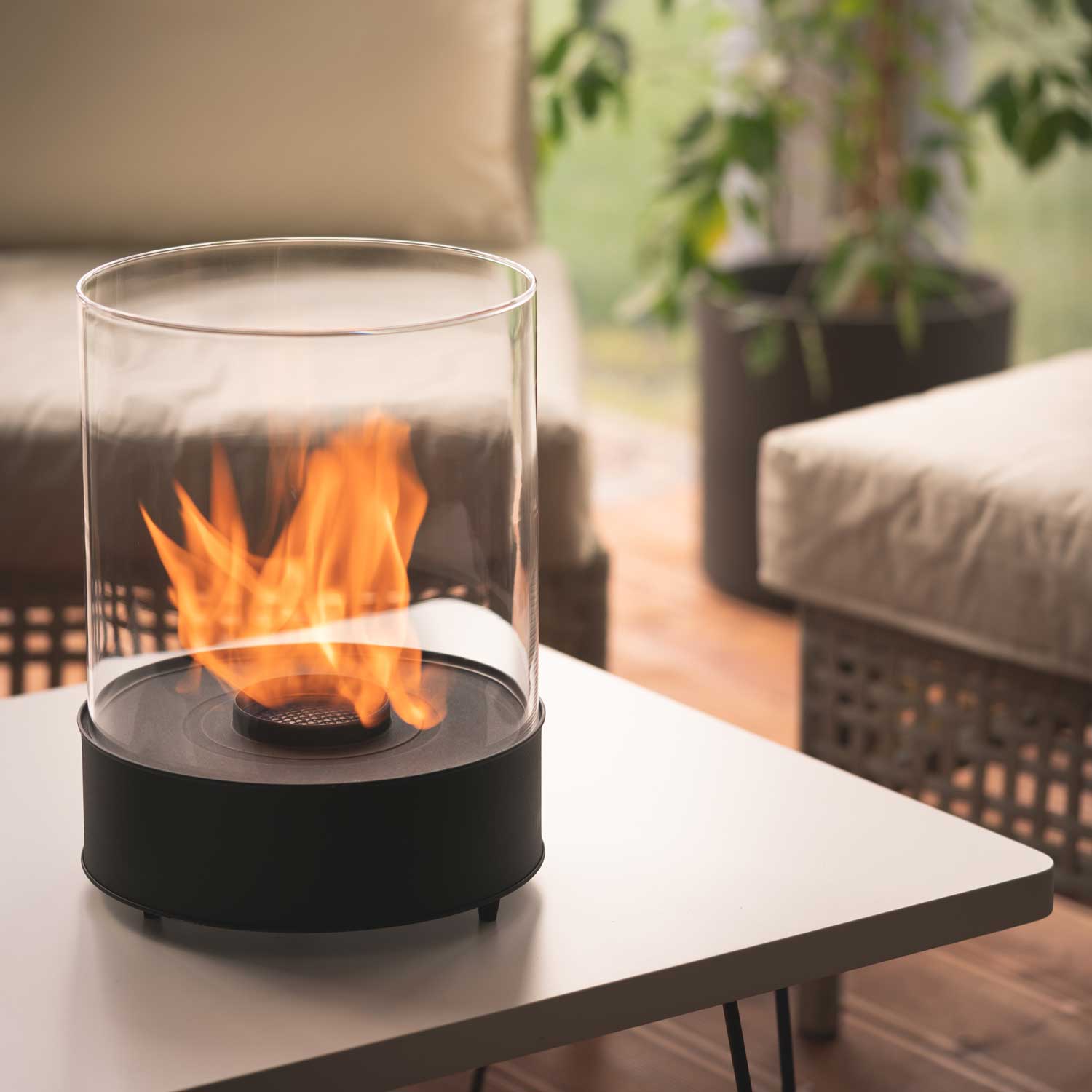 Chantico est une cheminée de table pratique et portable, idéale pour une utilisation en intérieur ou en extérieur, hiver comme été. Son faible poids facilite son transport d’une pièce à l’autre, et sa vitre cylindrique protège les flammes, visibles sur 360°, des conditions extérieures.
