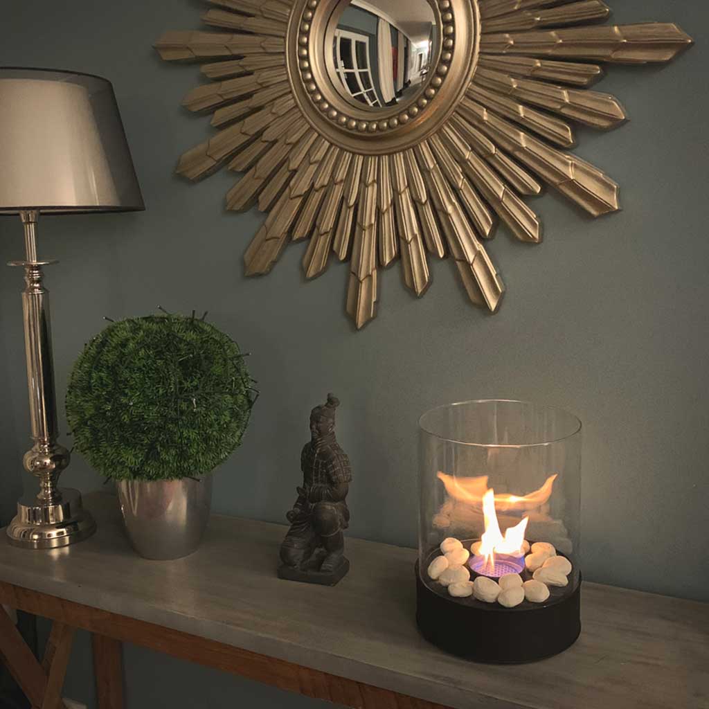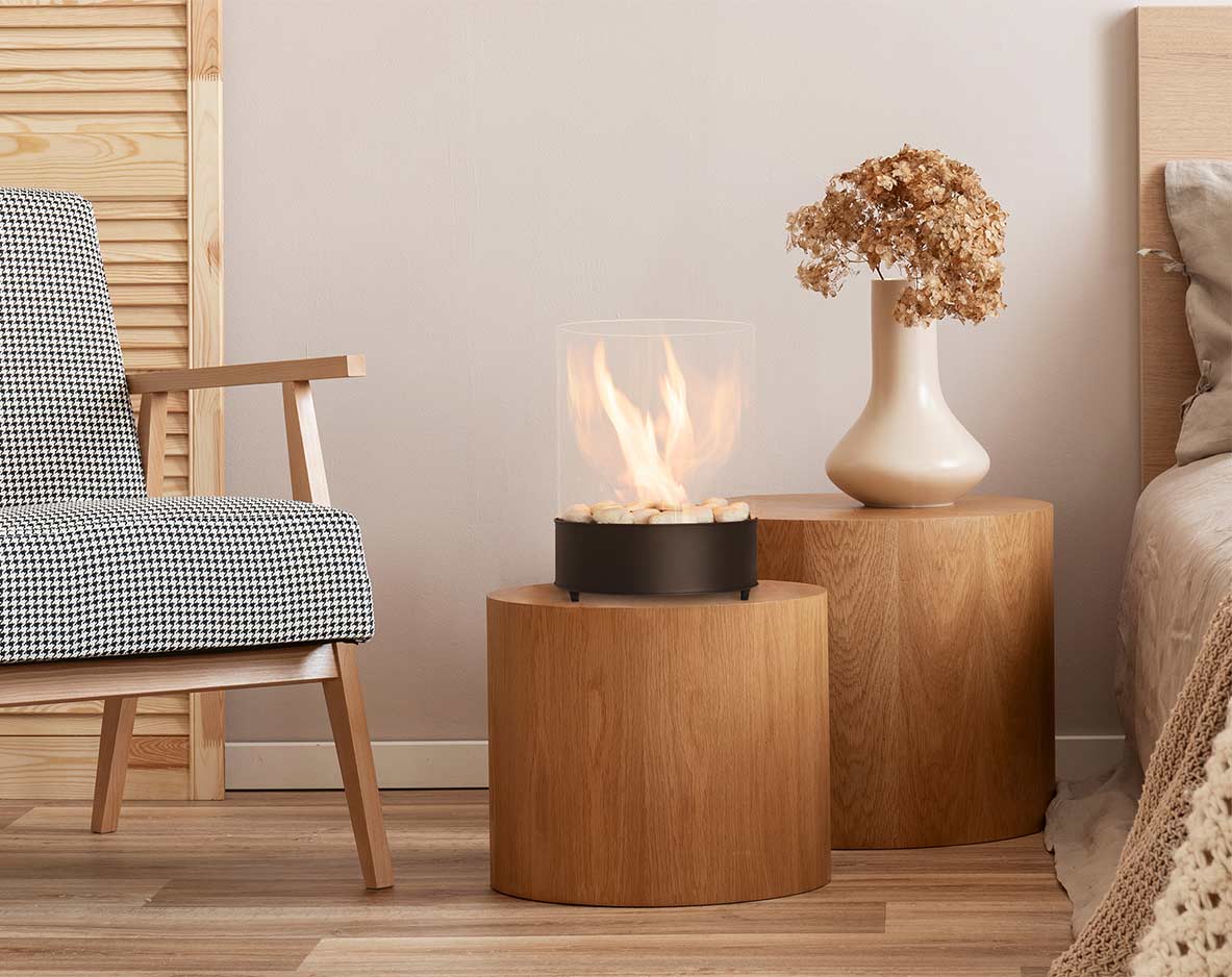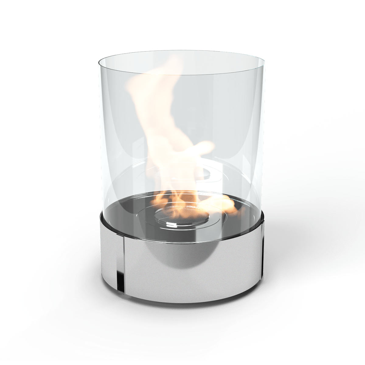 Chantico est une cheminée de table pratique et portable, idéale pour une utilisation en intérieur ou en extérieur, hiver comme été. Son faible poids facilite son transport d’une pièce à l’autre, et sa vitre cylindrique protège les flammes, visibles sur 360°, des conditions extérieures.