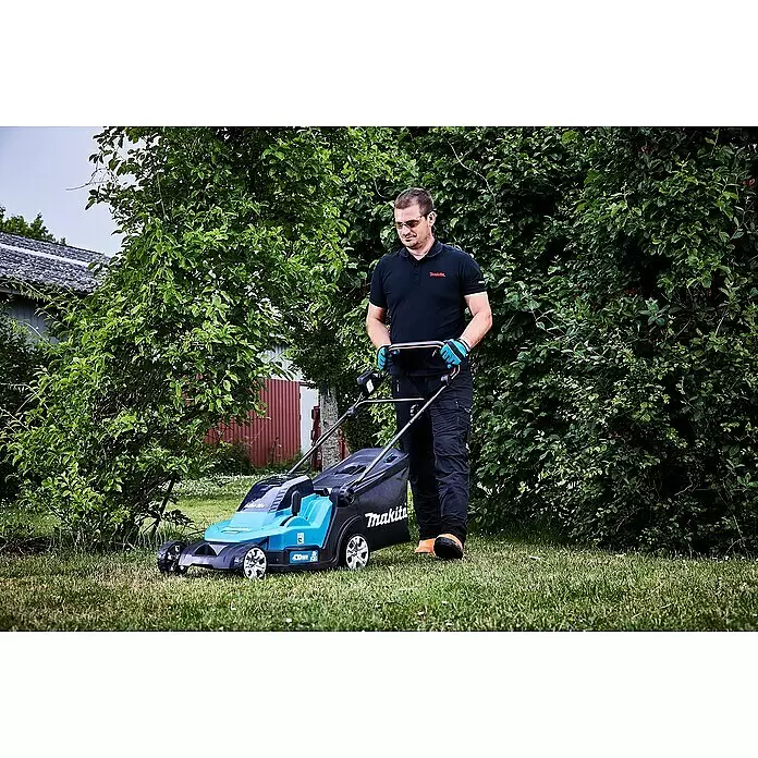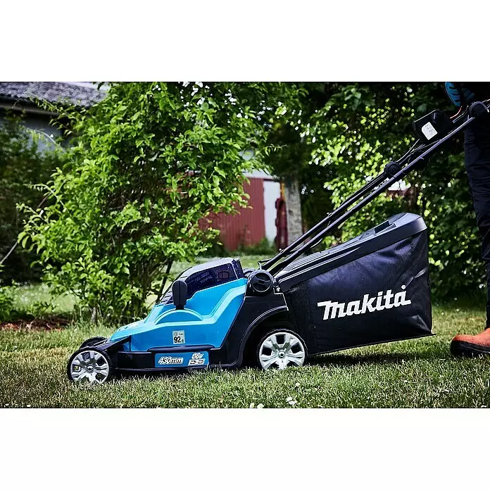 Der Makita Akku-Rasenmäher 2 x 18 V DLM432PT2 zeichnet sich aus durch eine geräuscharme, leichte Bedienbarkeit. Er ist mit seiner Schnittbreite von 43 cm sowie seiner Füllstandsanzeige im 50 Liter Grasfangkorb ideal für kleine bis mittlere Rasenflächen geeignet. Zwei in Reihe geschaltete 18 V Akkus werden parallel in separate Akkuhalterungen eingeschoben. Praktischerweise verfügt er über ein kompaktes Staumaß durch seinen faltbaren sowie höhenverstellbaren Holm. Auch randnahes Mähen wird ermöglicht durch nach innen versetzte Räder. Dank seiner speziell geformten Front ist merklich weniger Kraftaufwand beim Schieben notwendig. Die doppelte Batterieladestandanzeige befindet sich im direktem Sichtfeld des Anwenders. Der Rasenmäher bietet optimalen Schutz gegen Staub und Spritzwasser auch unter harten Bedingungen.