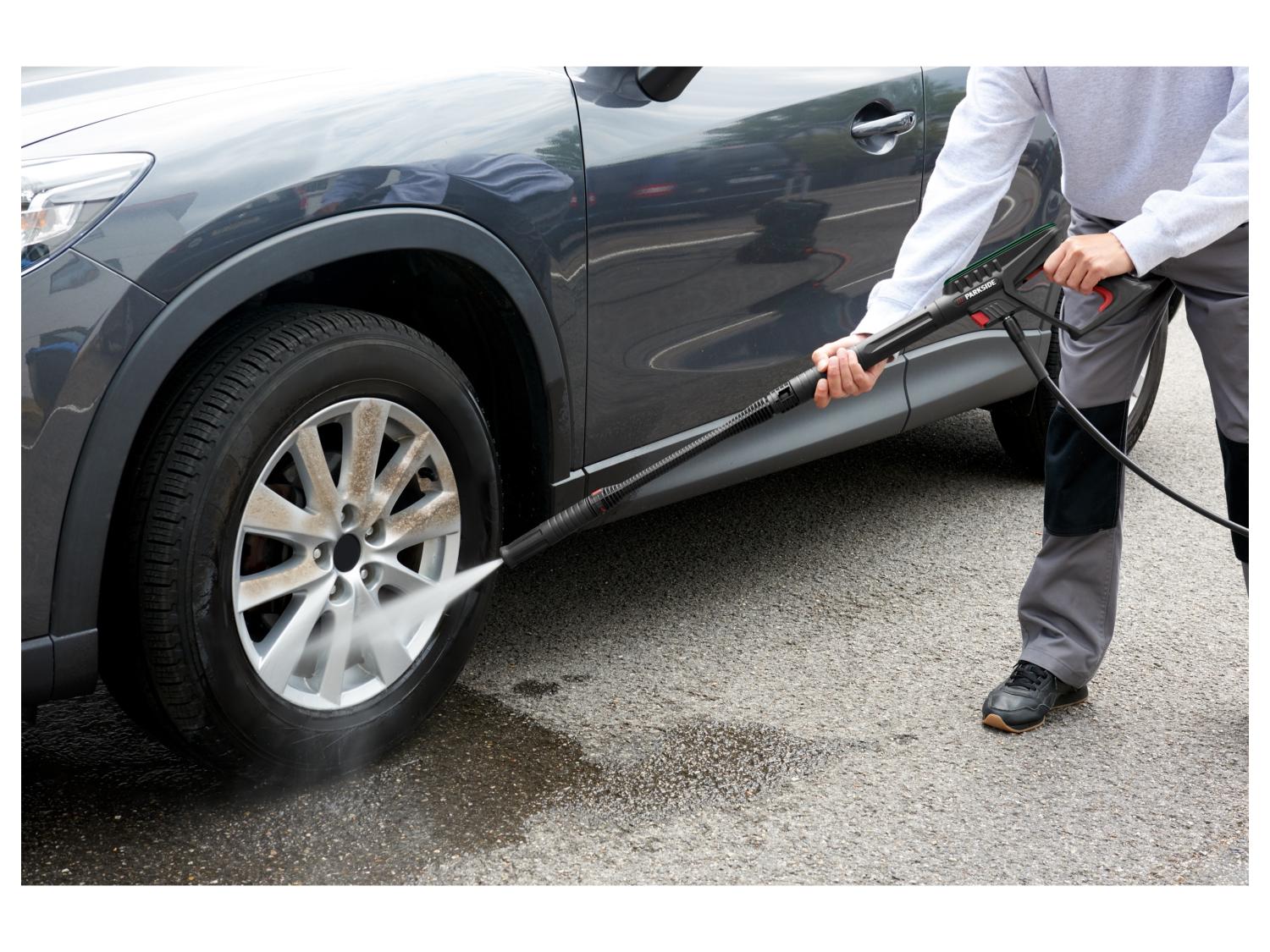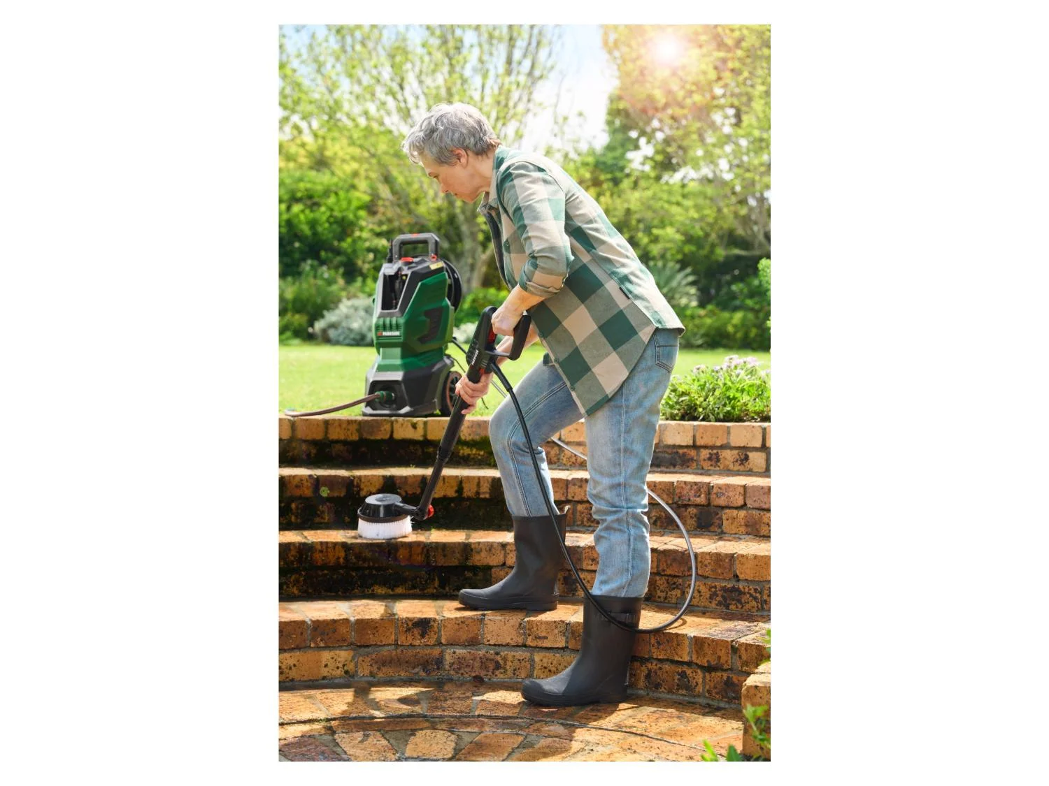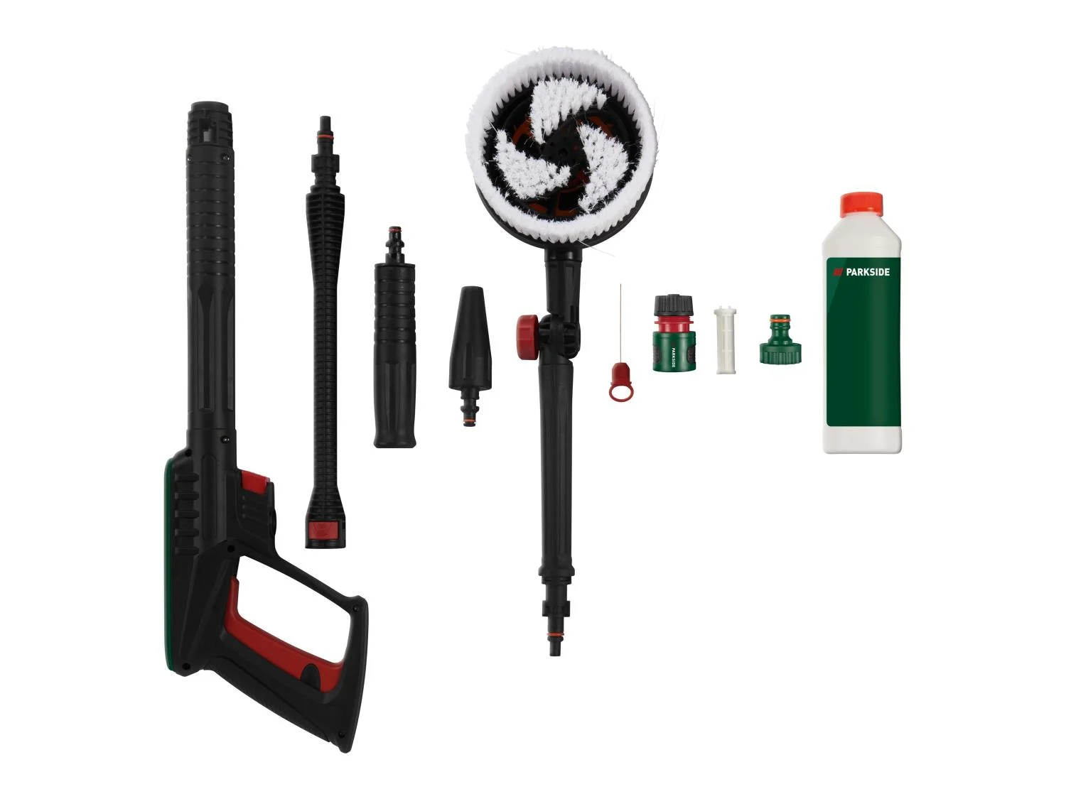 | Meegeleverde accessoires: | 1x pistoolgreep, 1x lans, 1x standaard-vario-mondstuk, 1x turbo-vuilfrees, 1x roterende wasborstel met knikgewricht, 1x mondstuk-reinigingsstift, 1x wateraansluiting met zeefinzet, 1x snelkoppeling met tuinslangadapter, 10 m hogedrukslang, 1x fles reinigingsmiddel (500 ml) |